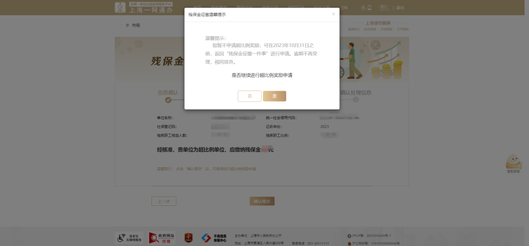 3、超比例獎(jiǎng)勵(lì)單位無需繳納殘保金,在應(yīng)繳納殘保金為0元的頁面點(diǎn)擊“確認(rèn)提交”后,根據(jù)提示選擇是否繼續(xù)進(jìn)行超比例獎(jiǎng)勵(lì)申請。