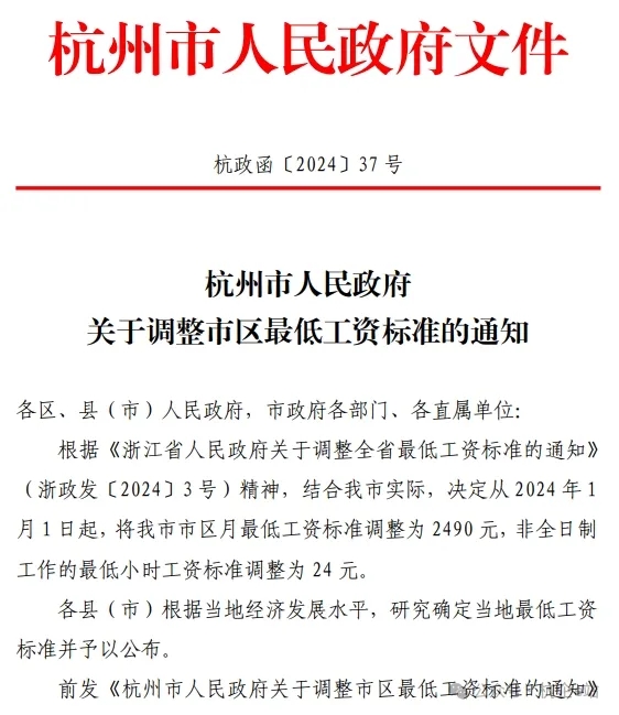 根據(jù)《浙江省人民政府關(guān)于調(diào)整全省最低工資標(biāo)準(zhǔn)的通知》(浙政發(fā)〔2024〕3號)精神,結(jié)合我市實(shí)際,決定從2024年1月1日起,將我市市區(qū)月最低工資標(biāo)準(zhǔn)調(diào)整為2490元,非全日制工作的最低小時(shí)工資標(biāo)準(zhǔn)調(diào)整為24元。