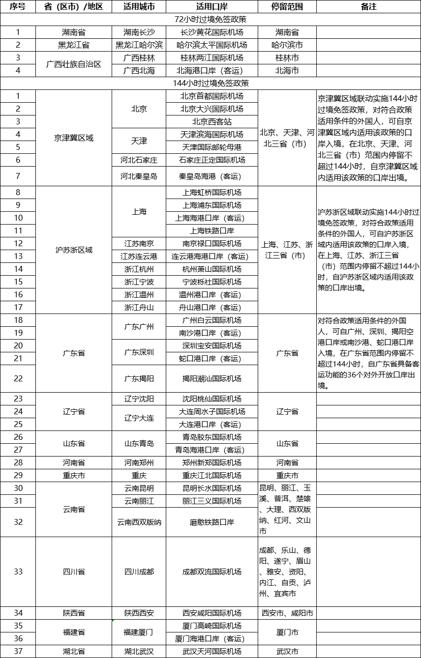 實施72小時或144小時過境免簽政策的城市口岸詳見下表: